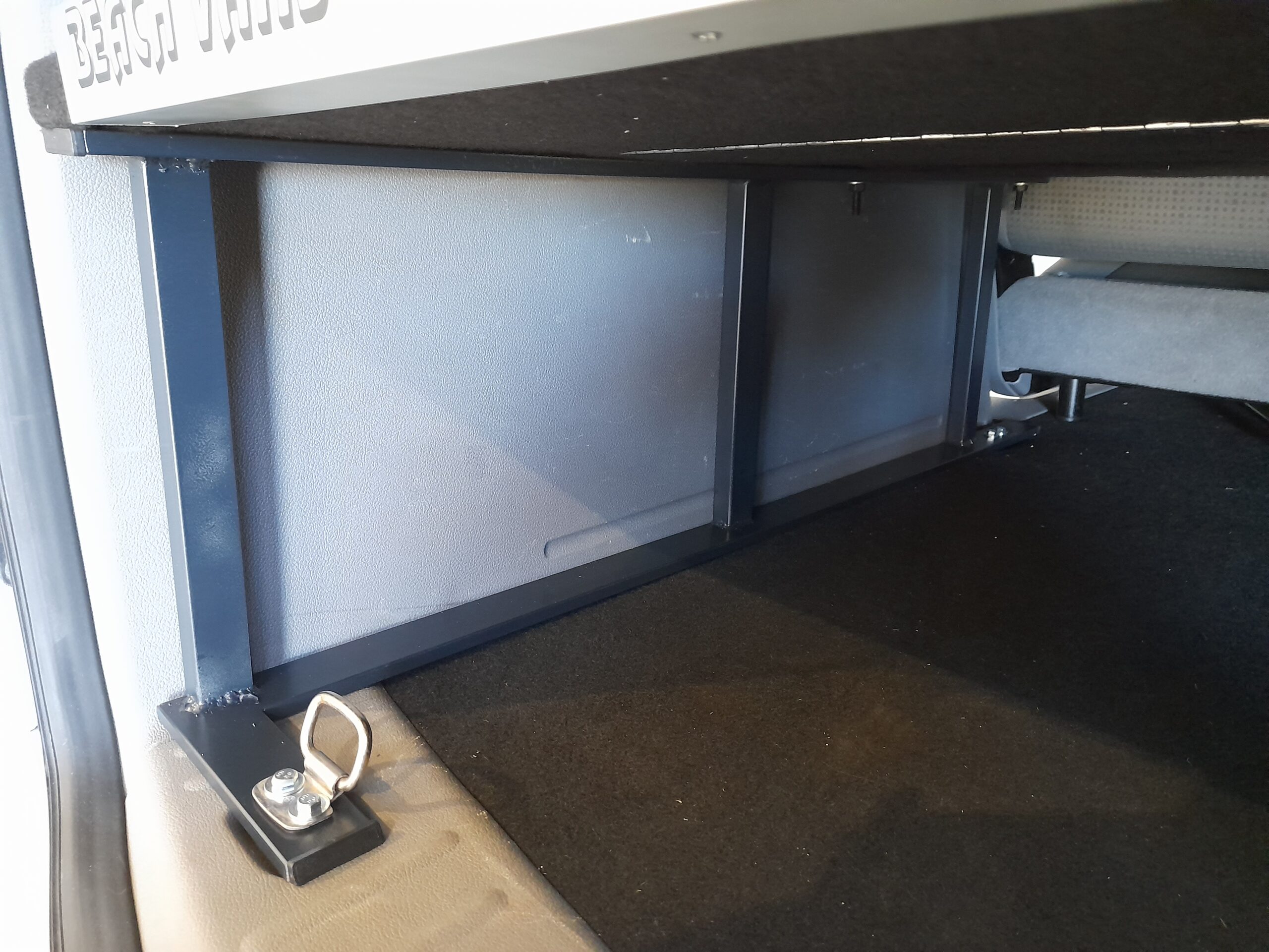 Die Konstruktion besteht aus geschweißtem Stahl, schwarz lackiert, für hohe Stabilität und eine saubere Optik. Die Bettplatten sind aus 18 mm starkem Pappelsperrholz gefertigt und mit schwarzem Teppich bezogen, was eine elegante Optik bietet und Geräusche sowie Vibrationen während der Fahrt reduziert.