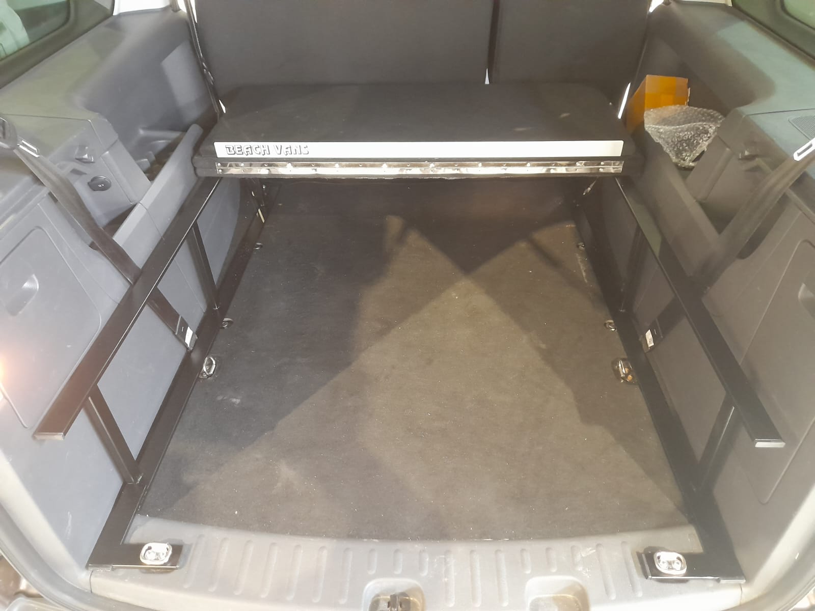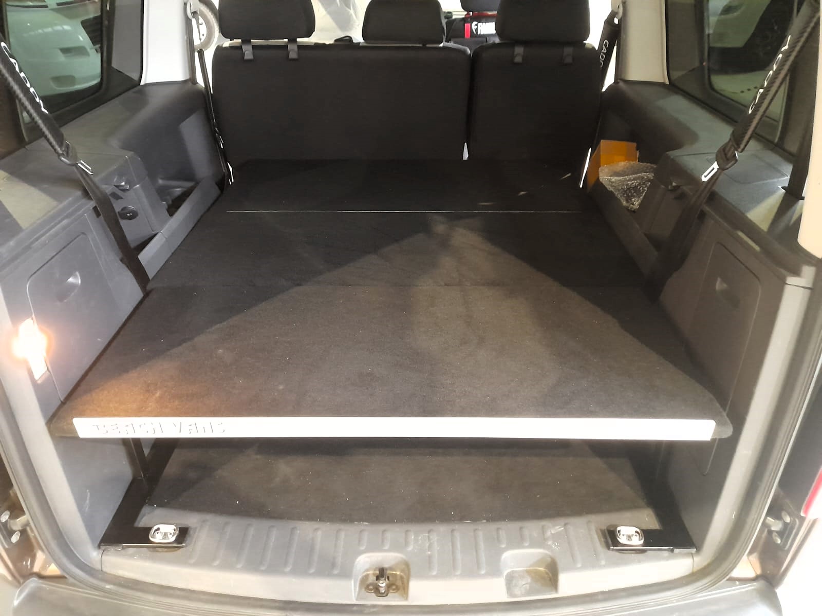 El colchón se apoya parcialmente sobre la estructura y parcialmente sobre los asientos abatidos de la fila central, quedando todo a la misma altura. El resultado: una cama estable y nivelada de 118 x 190 cm, ideal para dos personas.