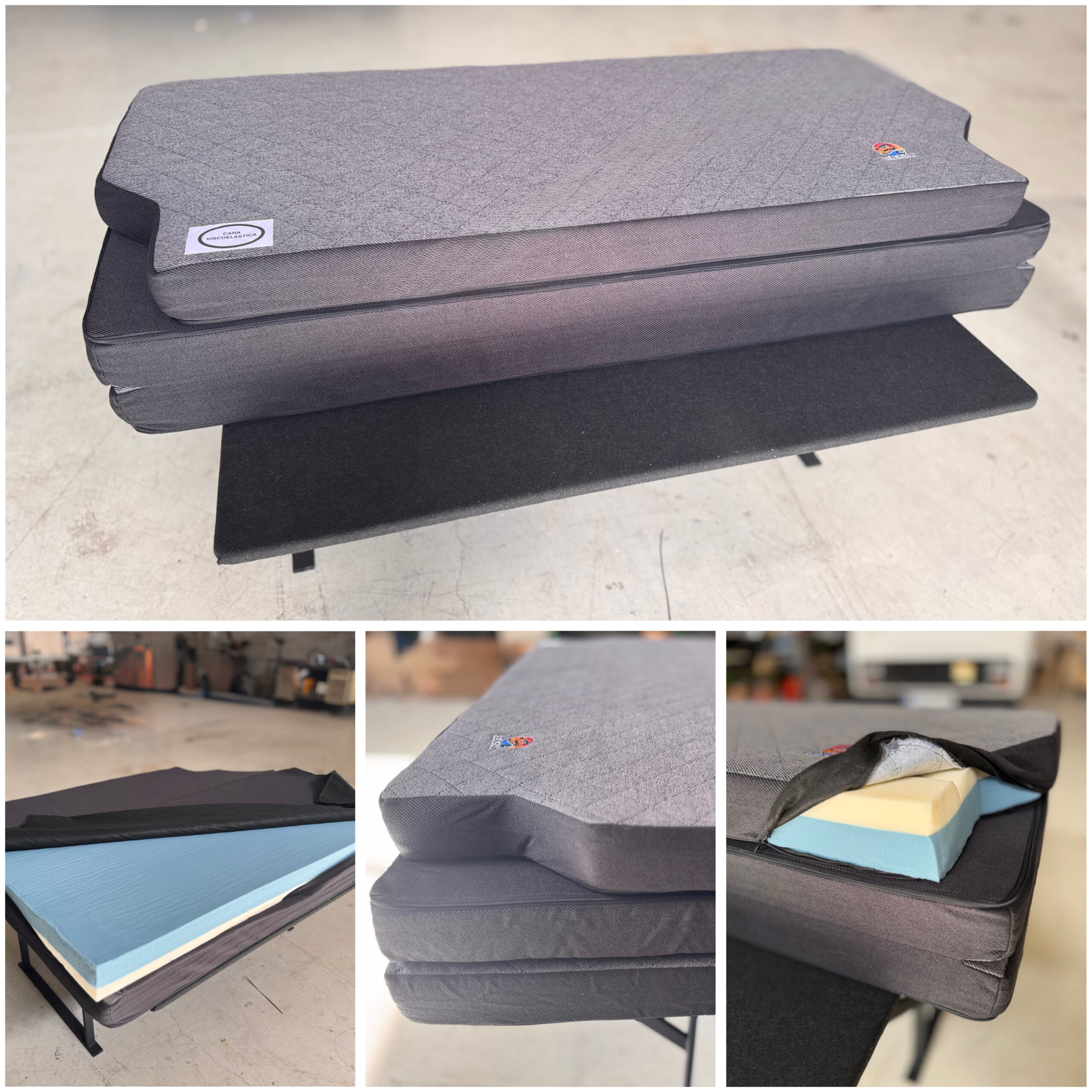 Puedes comprar el kit completo con colchón a medida, o solo la estructura metálica, perfecta si ya tienes un colchón o prefieres diseñar el tuyo propio. Si decides completar tu kit con colchón, te llevas una combinación ganadora: 5 cm de espuma HR35 de alta densidad más 3 cm de viscoelástica para un descanso firme y cómodo, sin que abulte demasiado cuando lo pliegas. Las fundas se pueden quitar para lavar, que siempre viene bien.