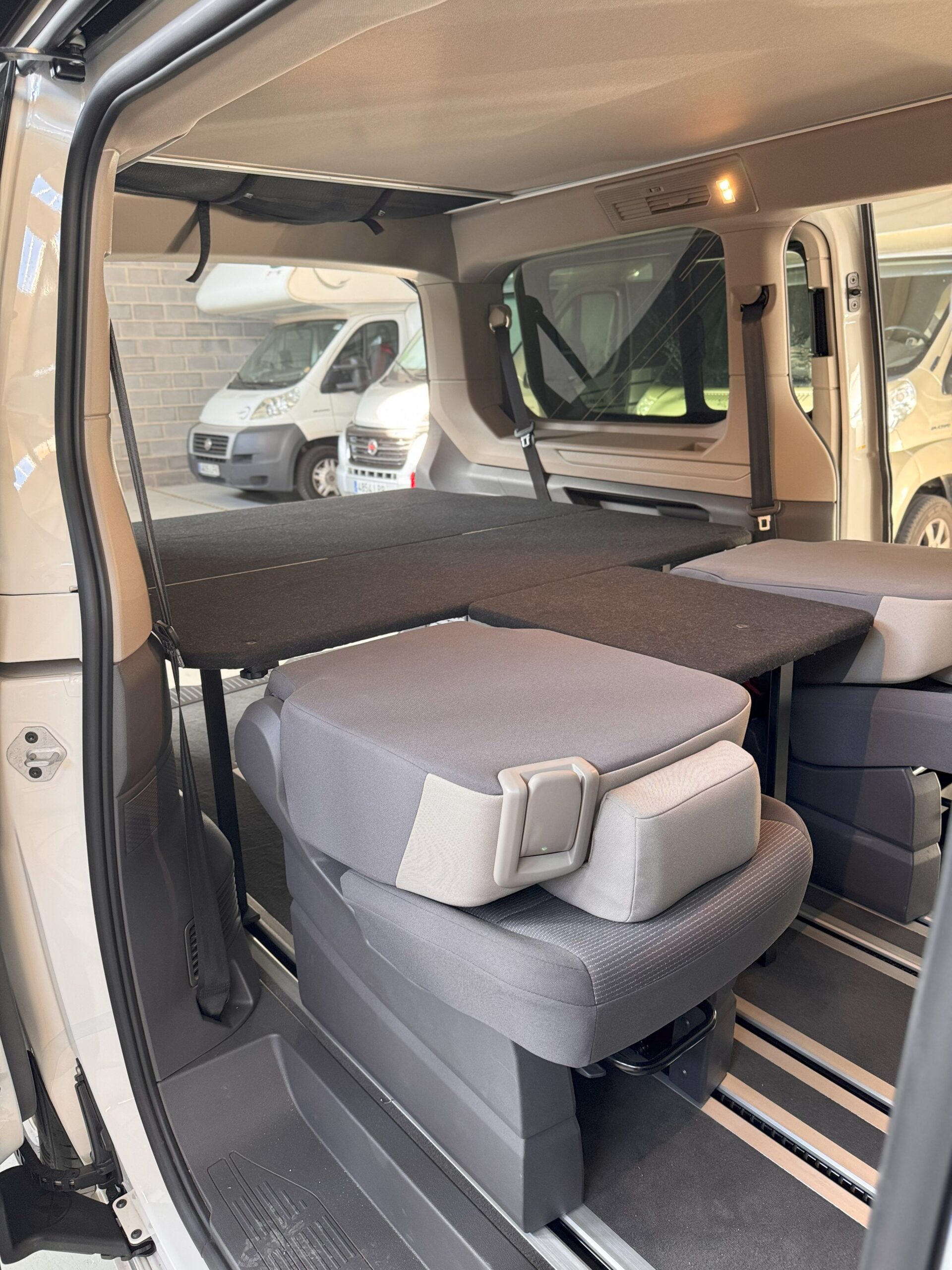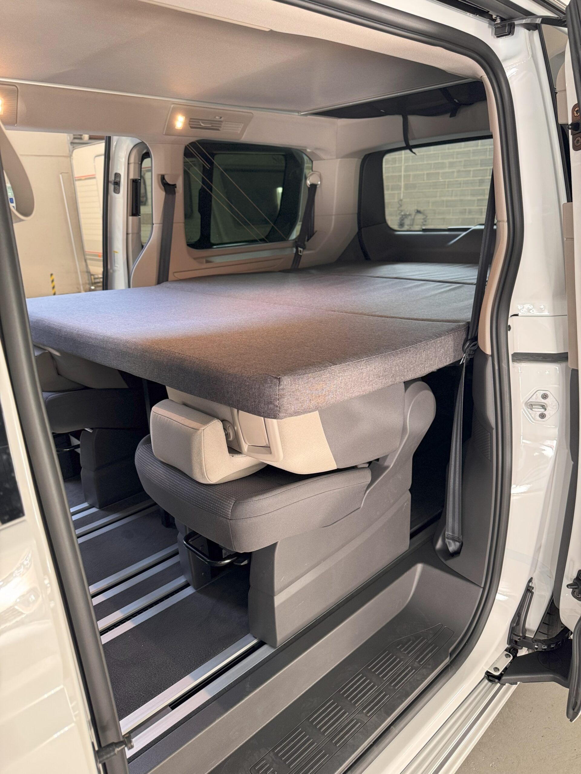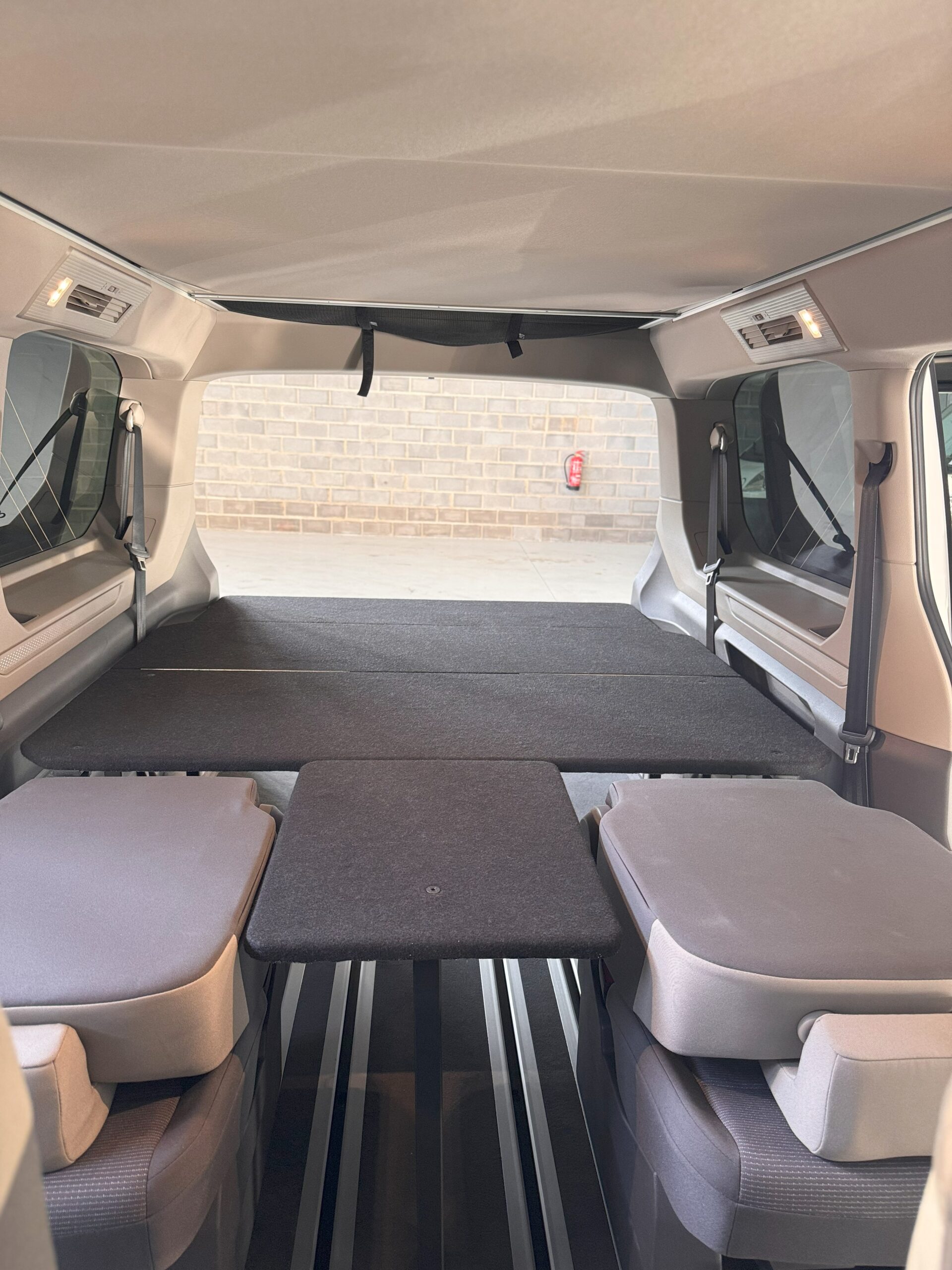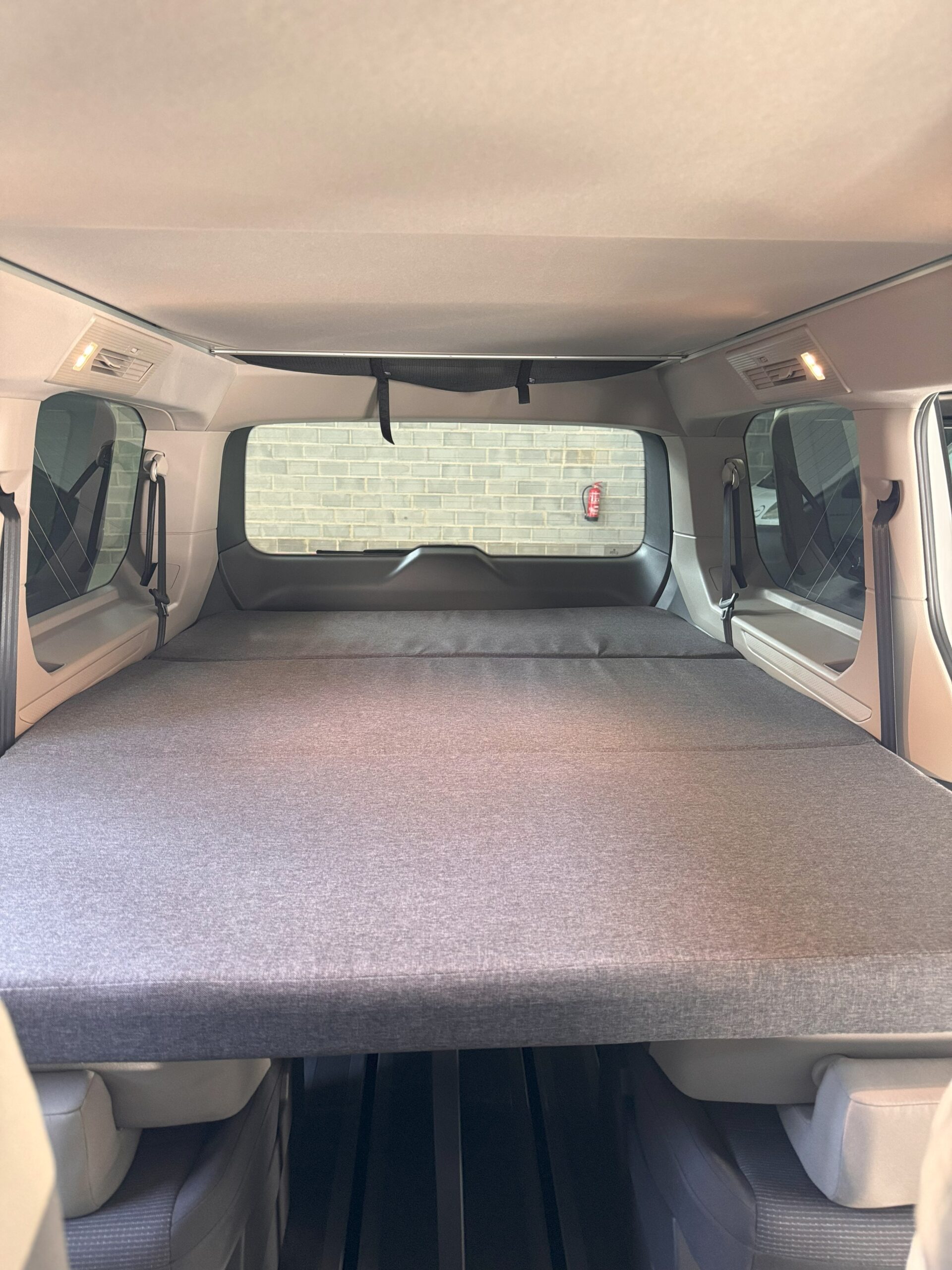 El colchón se apoya sobre la estructura y sobre la segunda fila de asientos, formando una cama continua, cómoda y nivelada.